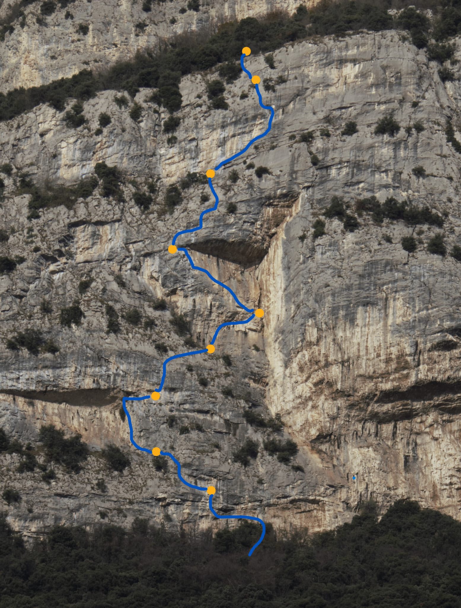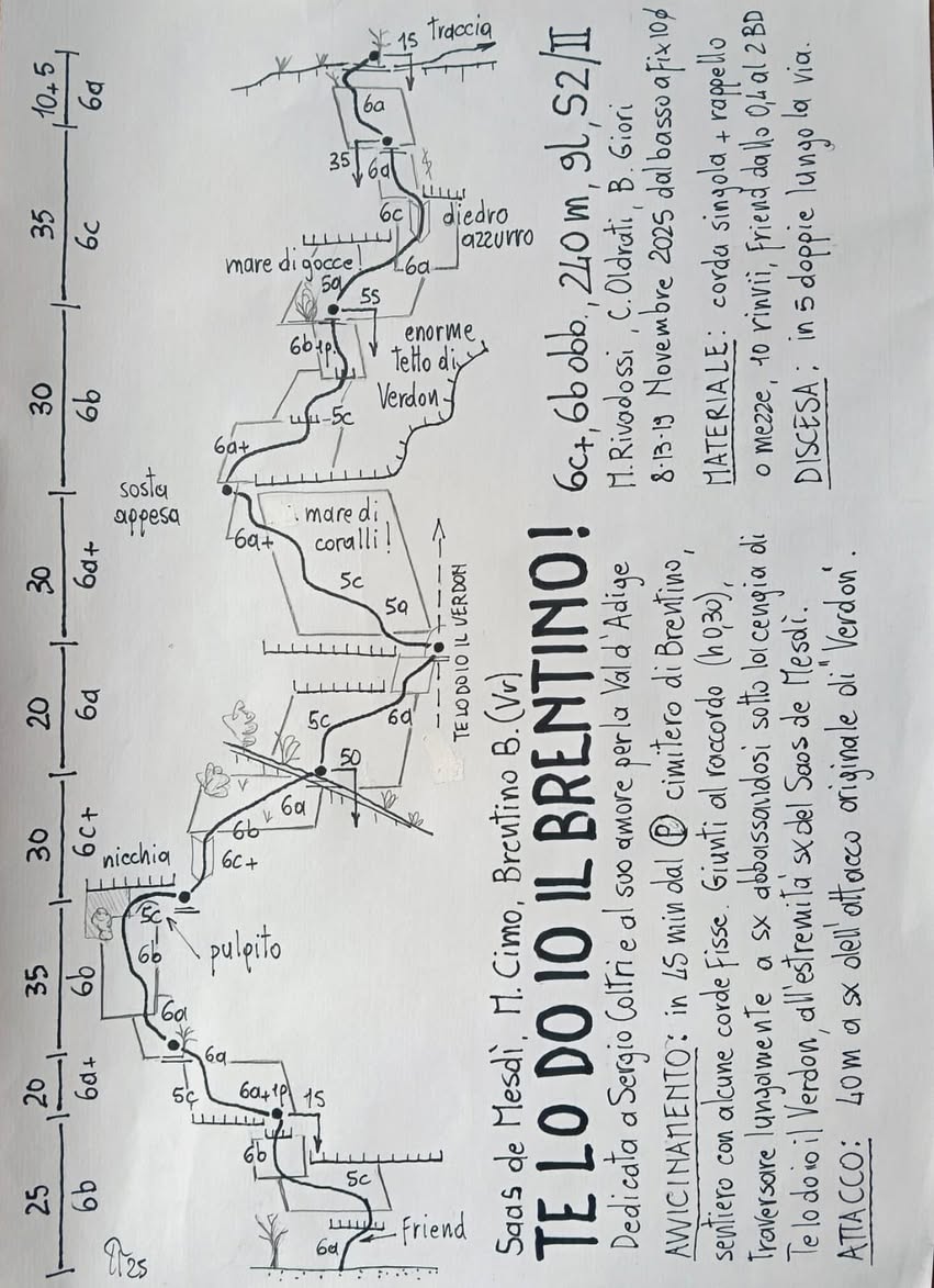 Aperta dal basso e senza perlustrazioni dall'alto, Te lo do io il Brentino trova la propria linea dove non era semplicissimo andare ad aggiungere qualcosa di valore effettivo. Ne è venuta fuori una via piuttosto potabile, se non strettamente plaisir. “Credo sia un esempio di come con astuzia si può trovare una via dove non c'è una prima scelta. Nonostante boschetti e tratti rotti, da smaliziati si riesce – anche con l'aiuto di qualche foto- a immaginare il percorso. E poi, con un po' di mestiere e intuito, sono riuscito effettivamente a tracciare una linea continua. Ne è venuta fuori una via che io definisco plaisir, anche se l'obbligatorio effettivamente è di 6b. Diciamo che è un po' pepata, ma così si inserisce in armonia tra le vie già tracciate. Mi ricordo che quando venivi a scalare a metà anni '90 da queste parti, prima delle richiodature, tornavi a casa che avevi fatto una vera esperienza, sia per i gradi affrontati che per le protezioni. Si trattava di vie sportive, ma la giornata te la dovevi guadagnare”.