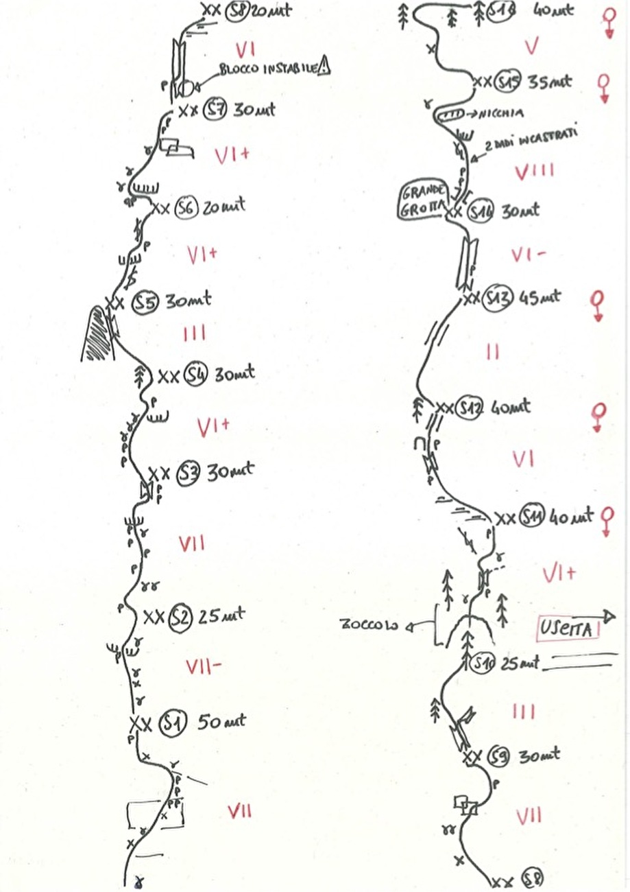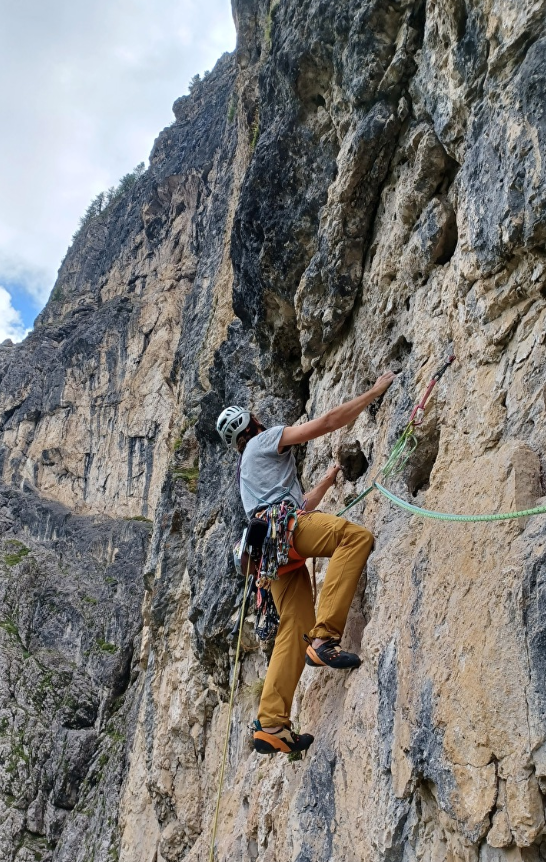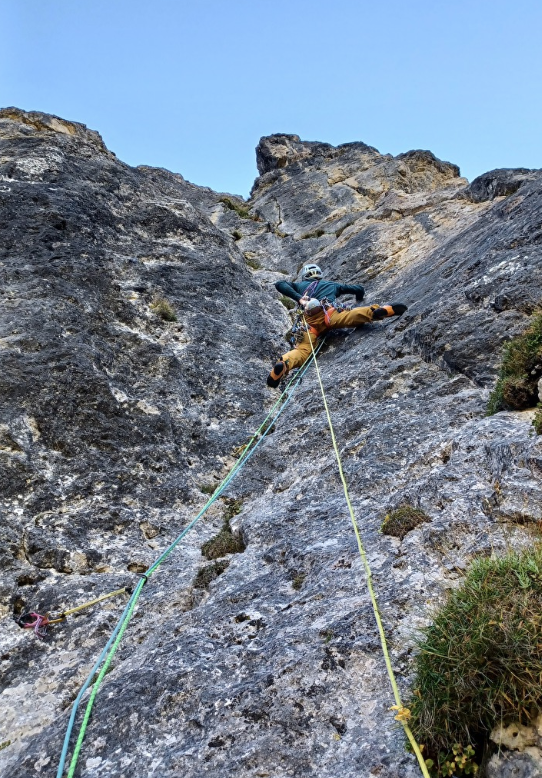 Dal punto di vista dell'arrampicata, non sono mancate le sorprese e la mente alpinistica ha dovuto lavorare. “All'inizio non era facile trovare una logica in quelle placche, perché mancava una struttura evidente, come un diedro o un pilastro. Poi però siamo riusciti a trovare una linea soddisfacente e sono venuti fuori i primi 10 tiri, che ci hanno portato alla grande cengia. Lì pensavamo che avesse senso fermarsi, guardando in alto non potevo immaginare sviluppi positivi. E invece un giorno siamo tornati, partendo direttamente dalla cengia. Sono venuti fuori altri 6 tiri su roccia ottima, una bella sorpresa. A due tiri dalla fine si arriva anche a una stupenda grotta”.