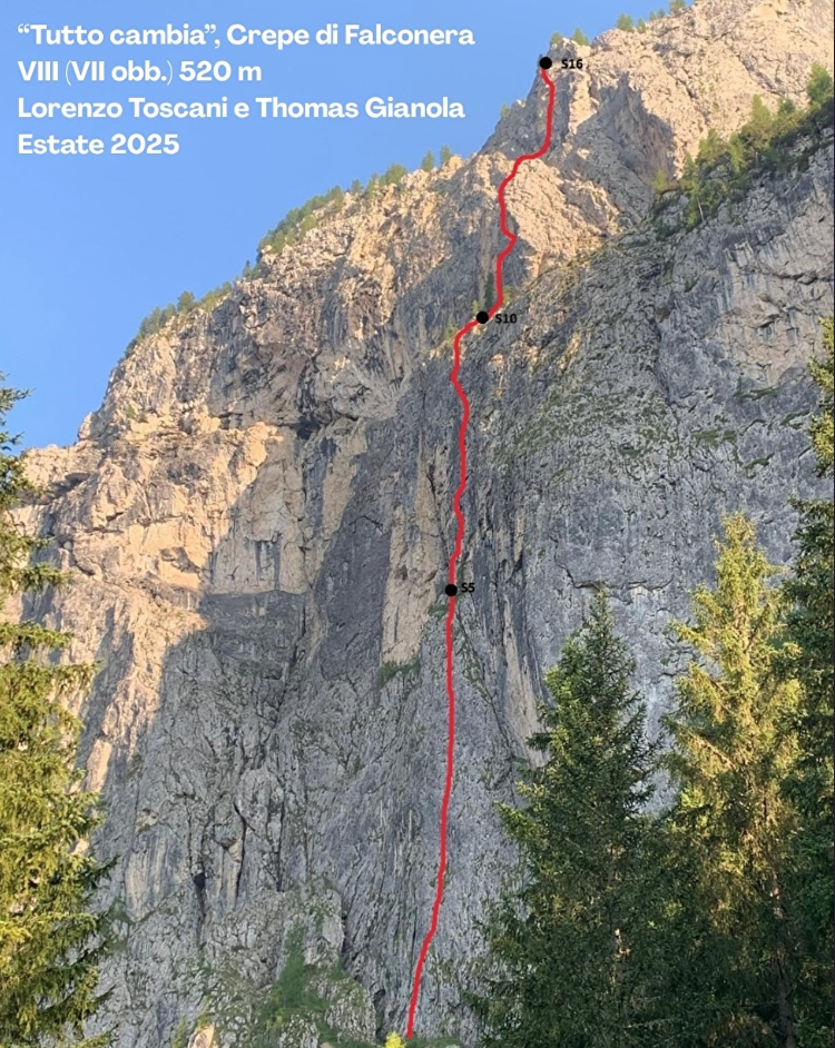 La montagna non sempre si concede per linee evidenti e sfacciatamente seducenti. A volte il gioco si fa più sottile, richiede di indagare la roccia con mano, dove l'occhio da lontano non troverebbe conferme. Curiosità e dedizione però spesso vengono ripagate, come nel caso di Tutto cambia (520 metri, VIII max, VII obbligatorio), una nuova via aperta da Thomas Gianola e Lorenzo Toscani alle Crepe di Falconera, una parete alle pendici della più celebre e celebrata Civetta.