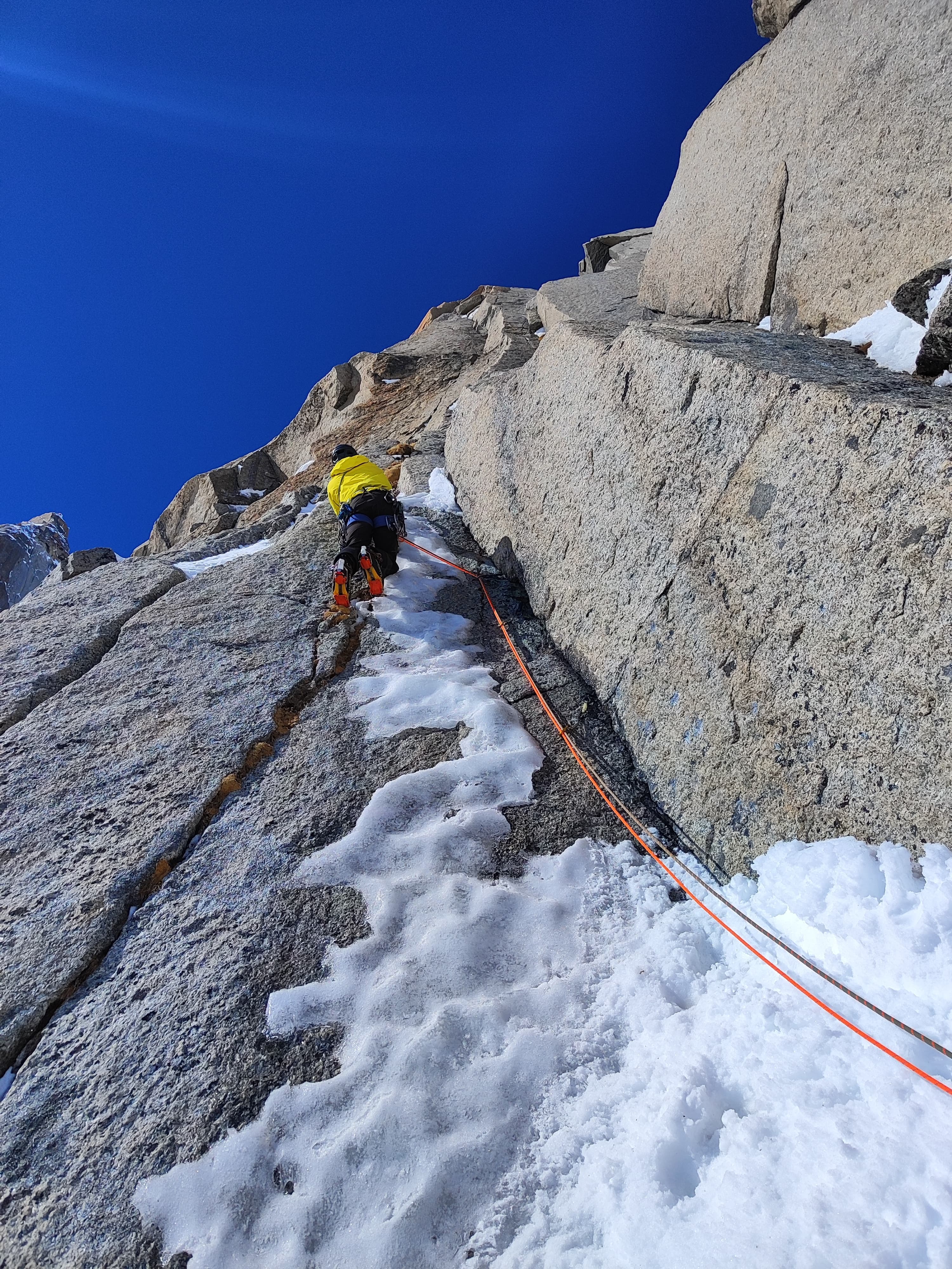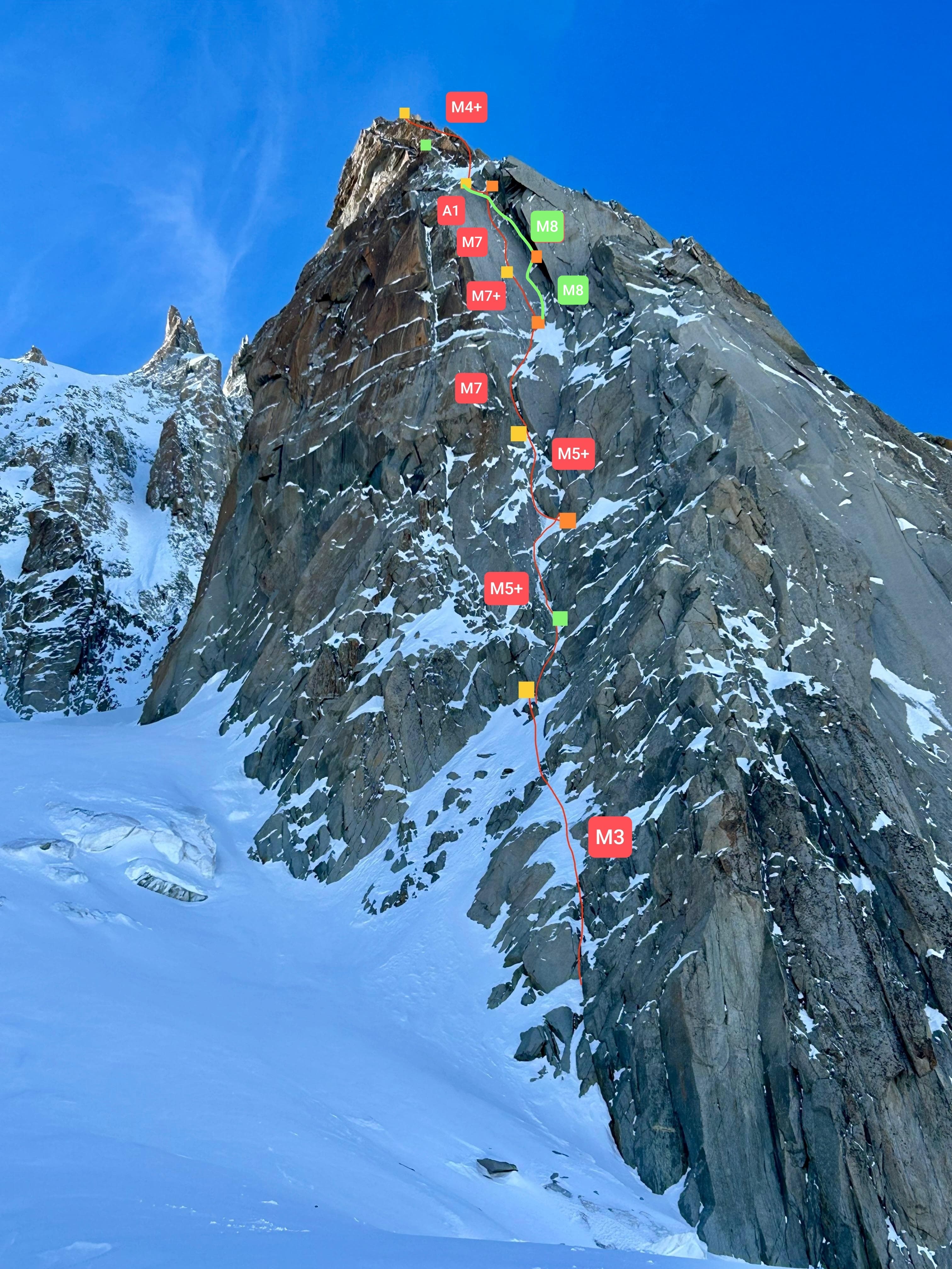 Ussha, in verde la variante francese © G. RavizzaLa via attacca su rampa o pendio di neve e prosegue collegando goulottine e ghiaccio. Alla quarta lunghezza le difficoltà si alzano decisamente, fino a M7. “Il torrione che anticipa la cresta finale è un placcone inclinato a 80°, scalabile da sotto per un sistema di fessure, oppure per un grande diedro. A noi piacevano di più le fessure, il diedro sembrava più secco e con passi verticali o strapiombanti. Sul bastione sommitale abbiamo trovato due tiri molto belli, con le piccozze che incastri nelle fessure. Ma sono due tiri belli impegnativi, perché la piccozza balla e i piedi sgommano sulla placca. Non tengono bene ed è da lì che ai miei compagni è venuto in mente il nome della via...perché Ussha è l'esclamazione che faccio quando vedo piccozze o ramponi che snappano”. Materiale indicato: friends 0.1-4 doppi, 0.4-2, un chiodo a lama. Soste a spit, a eccezione di L2 e L6, su friends.