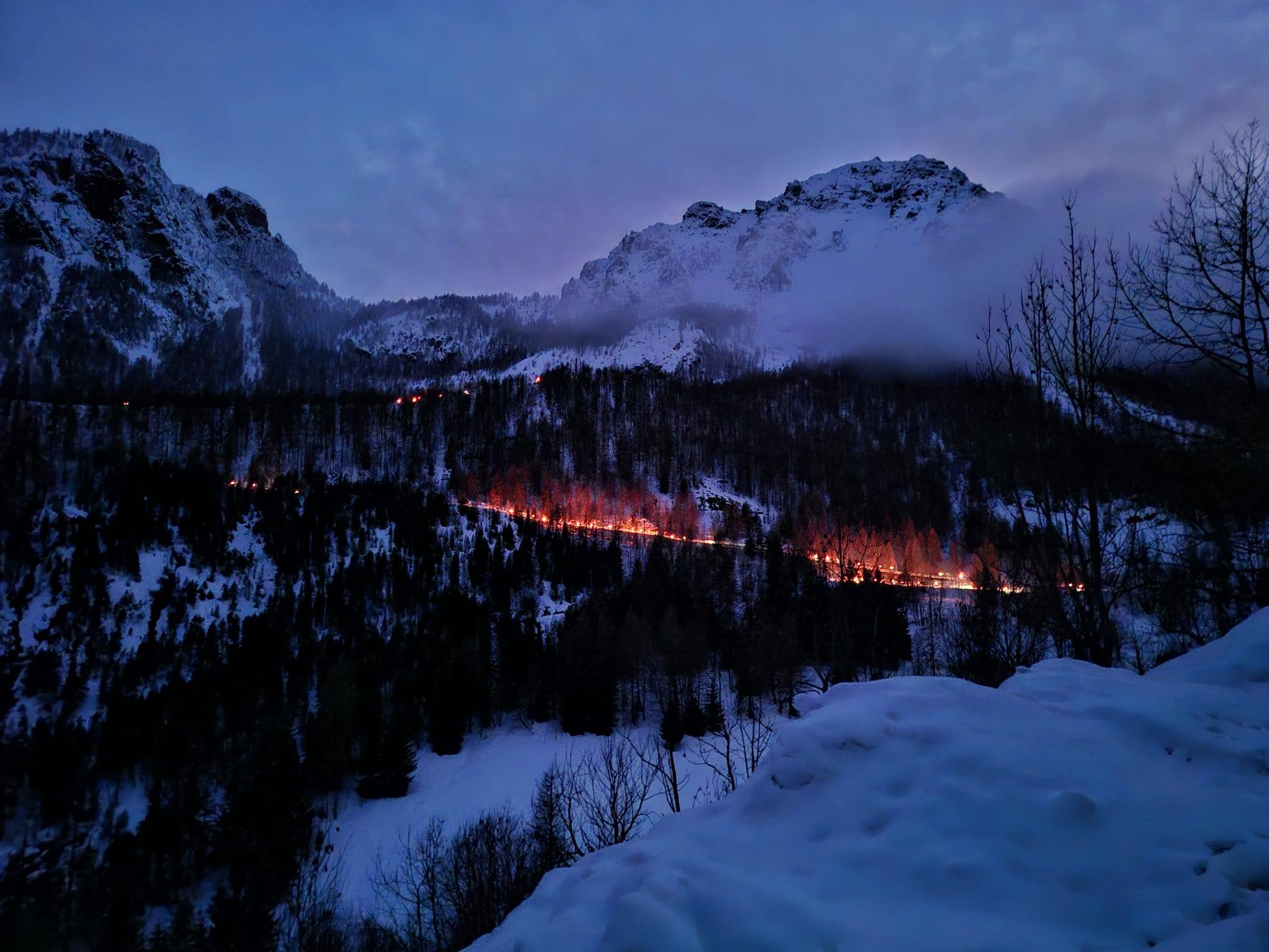 La fiaccolata di San Valentino. Foto Enrico ColloUna notte di luci, memoria e comunità: così la Valle Maira ha celebrato Carnevale e reso omaggio al compianto Nino Perino, guida alpina, maestro di sci e storico soccorritore della Valle Maira. Nella notte di San Valentino, la neve ha trasformato i boschi tra Saretto e Ponte Maira in un grande palcoscenico naturale: circa settanta sciatori, con fiaccole in mano, hanno illuminato per oltre un’ora i sentieri, creando una lunga catena di luce che ha accompagnato il pubblico presente in un’atmosfera intensa e suggestiva.