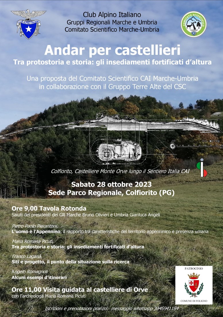 Il Comitato Scientifico Interregionale CAI Marche-Umbria in collaborazione con il Gruppo Terre Alte del Comitato Scientifico Centrale ha organizzato per Sabato 28 ottobre 2023, ore 9,00, una Tavola Rotonda presso la sede del Parco di Colfiorito dal titolo “Andar per Castellieri. Tra protostoria e storia: gli insediamenti fortificati d’altura”.