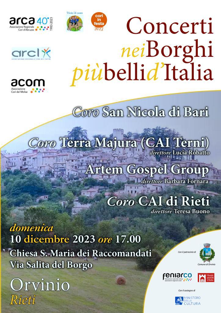 Il 10 dicembre 2023, alle ore 17,00 presso la Chiesa S. Maria dei Raccomandati, in Via Salita del Borgo ad Orvinio (RI), nell’ambito della rassegna “Concerti nei Borghi più belli d’Italia”, il Coro del Cai di Rieti, diretto dalla Maestra Teresa Buono, si esibirà insieme al Coro San Nicola di Bari, al Coro Terra Majura (Cai Terni), diretto dalla Maestra Lucia Robatto, al Coro Artem Gospel Group diretto dalla Maestra Barbara Fornara.
