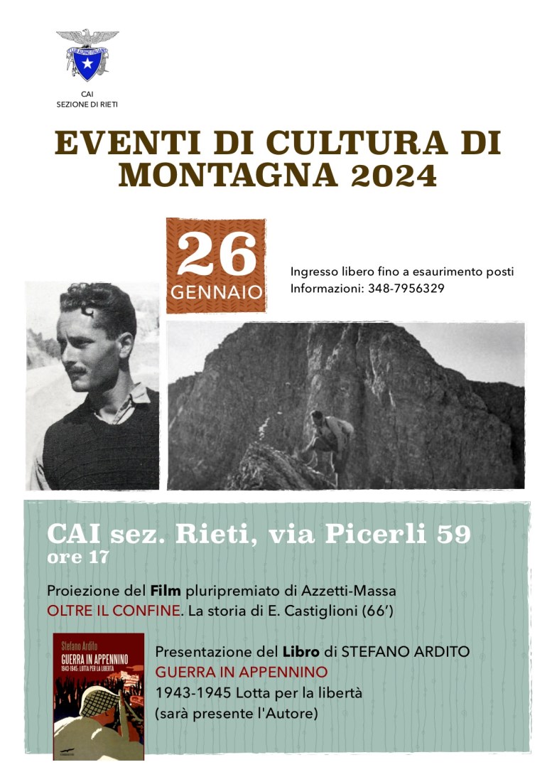 La locandina della serataDa gennaio, ecco lo start al primo degli eventi di cultura di montagna del Cai di Rieti che indagano il significato profondo del limite, tema attorno al quale ruoteranno le iniziative del primo semestre. La sezione invita tutti i soci e i cittadini alla presentazione del film Oltre il confine e del libro Guerra in Appennino di Stefano Ardito presso la propria sede in via Picerli 59 venerdì 26 gennaio ore 17 (ingresso libero). Dialogherà con il pubblico l’autore Stefano Ardito, noto scrittore di montagna e giornalista.