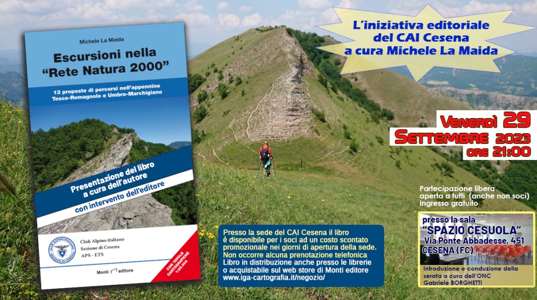 Il manifesto della presentazioneSi intitola “Escursioni nella Rete Natura 2000” il libro pubblicato da Monti Editore su iniziativa della Sezione cesenate del Club Alpino Italiano che sarà presentato venerdì 29 settembre alle 21 nella sala “Spazio Cesuola” in via Ponte Abbadesse 451, a Cesena.